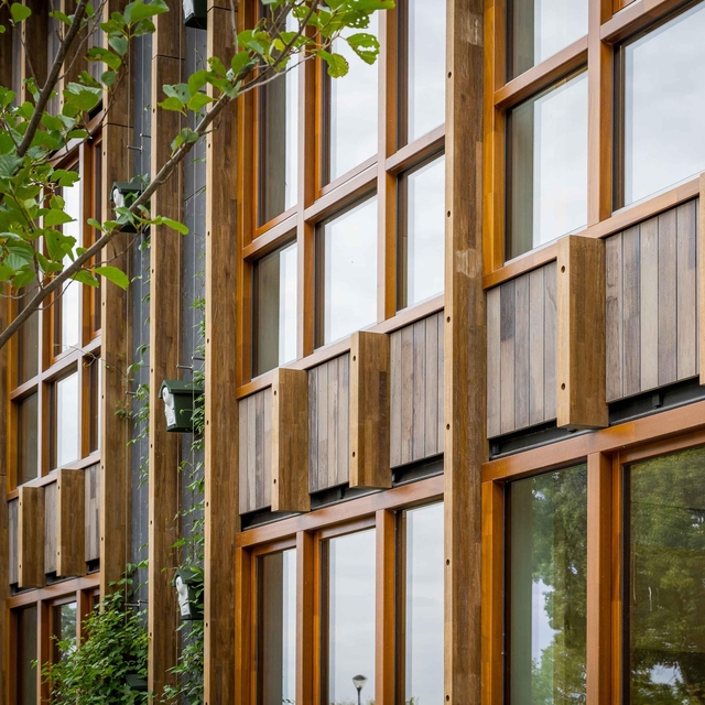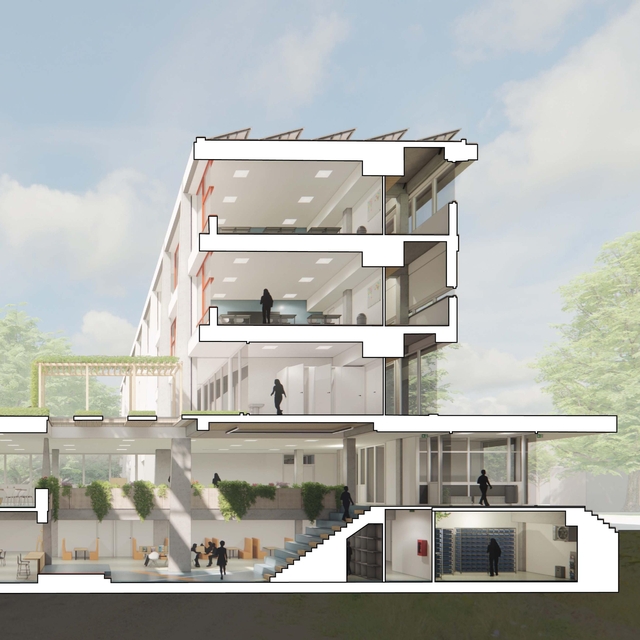 Ruimtelijk spektakel met veel licht en lucht. De nieuwbouw van Alfrink- en Sprongcollege is een prachtige compositie van verschillende onderwijsruimtes in een compact gebouwvolume. “Het interieur heeft een lichte, natuurlijke uitstraling met houten kozijnen en trappen.”