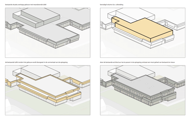 De verticale houten bekleding – opgebouwd uit drie verschillende plankbreedtes – zorgt voor een speels en afwisselend patroon dat kinderen uitnodigt tot verwondering. De meanderende luifels biedt zonwering, ruimte voor installaties en geeft het gebouw een dynamische uitstraling. De gevel is over de uitbreiding doorgezet waardoor de uitbreiding architectonisch geïntegreerd is op het bestaande gebouw.”