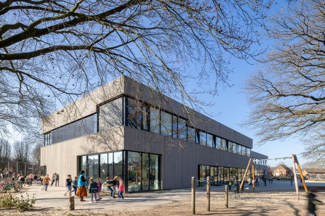 Vanuit het oogpunt van duurzaamheid is gekozen voor een compact twee-laags gebouw. De ruimten op de begane grond en de verdieping worden ruimtelijk en visueel met elkaar verbonden door het centrale hart. Een grote vide zorgt voor licht en lucht in deze ontmoetingsruimte waar zowel ouders en kinderen als leerkrachten gebruik van kunnen maken. Via het centrale hart kan iedereen de school binnenkomen en doorlopen naar de kinderopvang of basisscholen De Zwaluw of De Welp. De lokalen krijgen door de grote raampartijen in de gevels veel daglicht binnen, wat zorgt voor een goede leeromgeving. Op de begane grond loopt binnen en buiten mooi in elkaar over door de kozijnen die doorlopen tot aan het maaiveld.