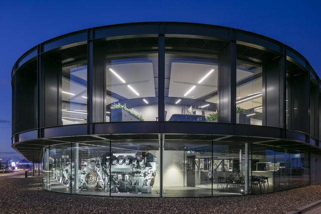 Dat start, wanneer je het pand benadert, bij de ‘etalage’. Bij binnenkomst wordt de maritieme, technische sfeer versterkt. Je kunt niet alleen een blik werpen in de showroom, maar ook in de achterliggende loods waar ruim 50 à 60 motoren wachten op een nieuwe eigenaar. De transparante entreehal over twee bouwlagen verbindt de verkoopruimte met de eerste verdieping. Hier zijn de verschillende werk- en vergaderplekken ondergebracht. Grote, groene wanden begeleiden de bezoeker naar boven en zorgen voor een natuurlijke, zachte tegenhanger van de strakke architectuur.