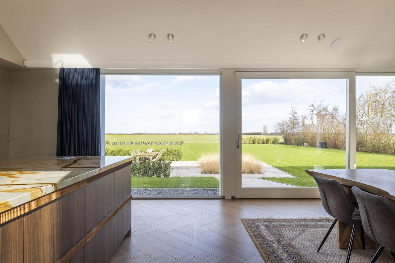 In de woning vangen alle verblijfsruimten een blik op het polderlandschap. De anonimiteit van de plek wordt doorbroken door in de verte – bij helder weer – net zicht te hebben op een hoogbouwtoren in Rotterdam.